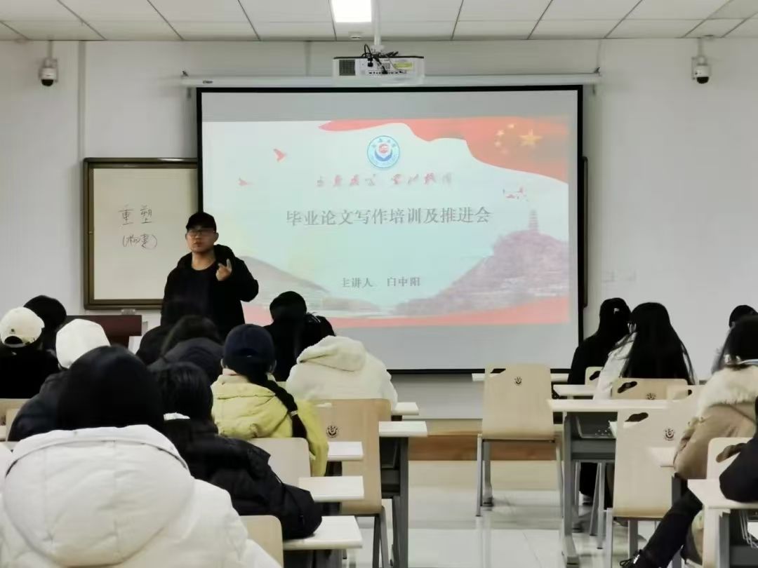 举办了毕业论文写作培训及推进会,对2021级全体同学的毕业论文撰写与推进工作进行了详细部署。会议由学院教学秘书、研究生24级班主任白中阳老师主持,教学办李建宁老师和2021级全体本科生参加了本次会议。