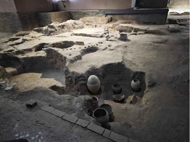 在参观完出土文物后,大家在遗址大厅继续参观学习。经考古发掘得知,半坡遗址分为居住区、墓葬区和制陶作坊区。其中,居住区占地约30000平方米,其布局是以一座大型房屋为中心,中小型房屋窖穴等散布周围,其外围环绕大型壕沟。壕沟长300多米、深约5米、宽约6米,是护卫村落、不受外来部落的侵犯,防止野兽突然袭击的防御工事。
