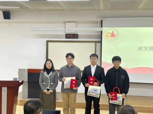 李生策老师揭示投票结果,宣布新一届团学组织成员的当选名单,刘艳老师为其颁发聘书,并合影纪念。