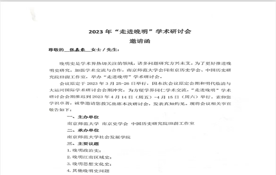 21级中国史硕士研究生张嘉豪于2023年4月参加南京师范大学等主办的2023年“走进晚明”学术研讨会